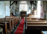 Looking towards the east end. This most attractive church was completely restored in the very early 19th century gothic style. The interior shows the nave and chancel, which are continuous under a hammerbeam roof of 1908. The chancel is separated from the nave by a quadrant-moulded C17 tie-beam. There are also two large pews in the chancel, and the pews in the nave are box-pews, dating from the Victorian restoration. |