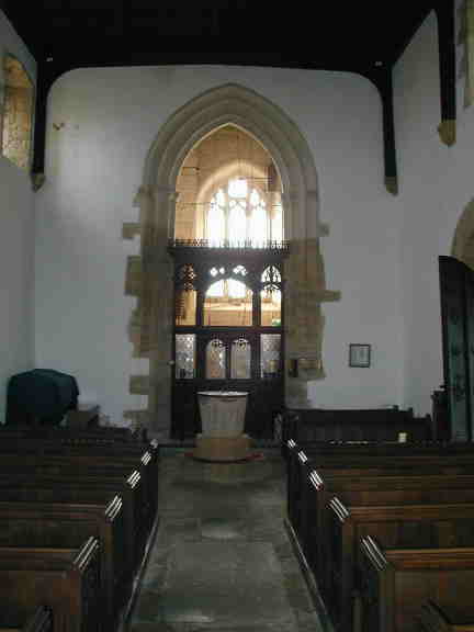 of the nave, font and tower screen from the chancel. |